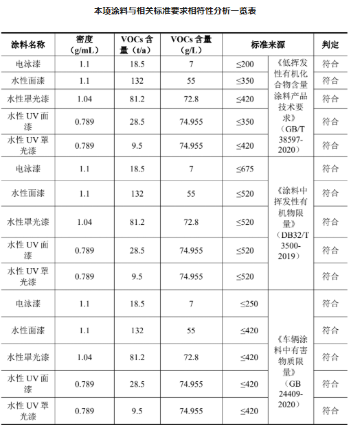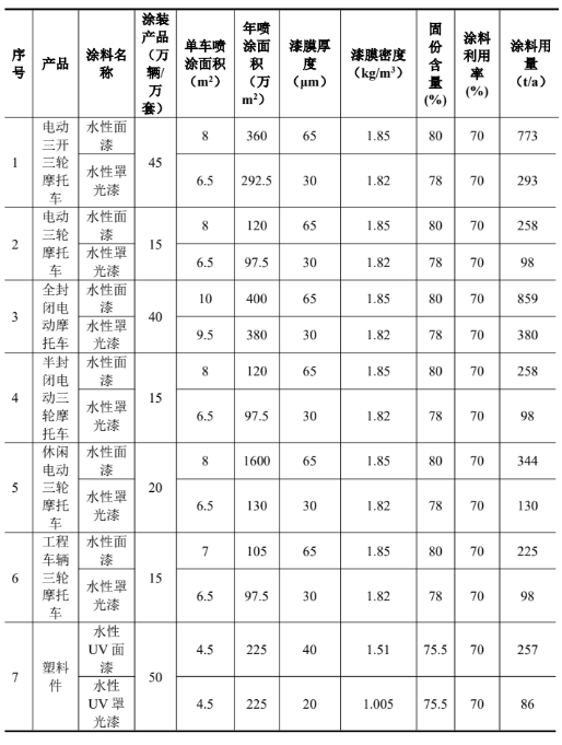 对比上表按照涂料密度、挥发分含量计较出来的涂料VOCs含量,喷涂操纵率约70%,按照《中华人平易近国保》《中华人平易近国影响评价法》《扶植项目办理条例》和《扶植项目影响评价分类办理名录》的,则一条全封锁电动摩托车喷涂出产线t/a。因而应编制影响演讲表。本项目利用水性UV面漆、水性UV罩光漆共400t/a,本项目水性UV面漆利用量为300t/a,按照企业供给的材料?